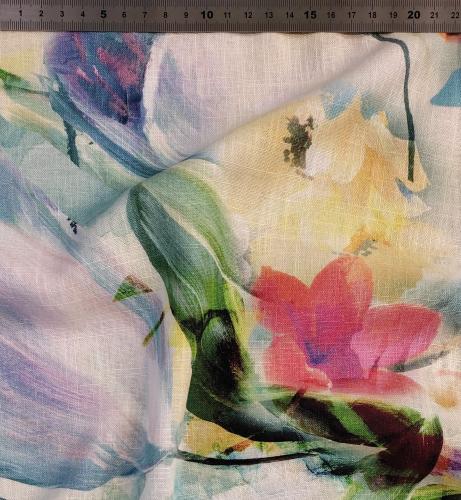 Osez le lin  mélangé à la viscose. A l'imprimé floral et acidulé, le Lin Viscose est un tissu très chic pour vos chemises, robes ou pantalons d'été. Les motifs de ce lin imprimé sont réalisés avec une impression digital, utilisant des encres spéciales à base d'eau. Ces encres sont plus respectueuses de l'environnement, moins toxiques et biodégradables.