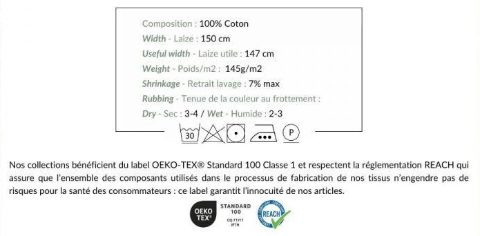 Enfin de vrais tissus de qualité... Certifié Oeko-Tex® nos tissus vous garantissent une qualité contrôlée en plus de respecter l'environnement durant son procès de fabrication.